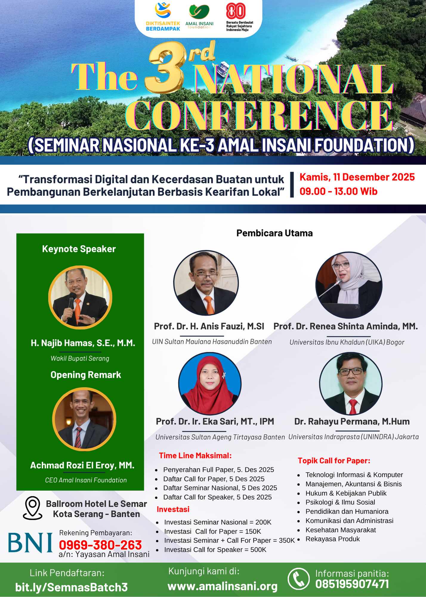 Dalam rangka Dies Natalis Amal Insani Foundation yang ke 9, dan sekaligus menutup tahun 2025, Amal Insani Foundation kembali menyelenggarakan kegiatan tahunan SEMINAR NASIONAL dan CALL FOR PAPER. Silahkan anda mendaftarkan diri sebagai salah satu peserta yang akan mendapatkan prioritas layanan kami.