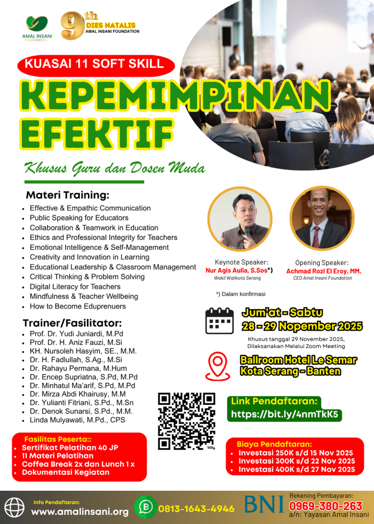 Dalam rangka Dies Natalis Amal Insani Foundation yang ke 9, dan sekaligus menutup tahun 2025, Amal Insani Foundation kembali menyelenggarakan kegiatan tahunan TRAINING KEPEMIMPINAN EFEKTIF UNTUK GURU DAN DOSEN. Silahkan anda mendaftarkan diri sebagai salah satu peserta yang akan mendapatkan prioritas layanan kami.